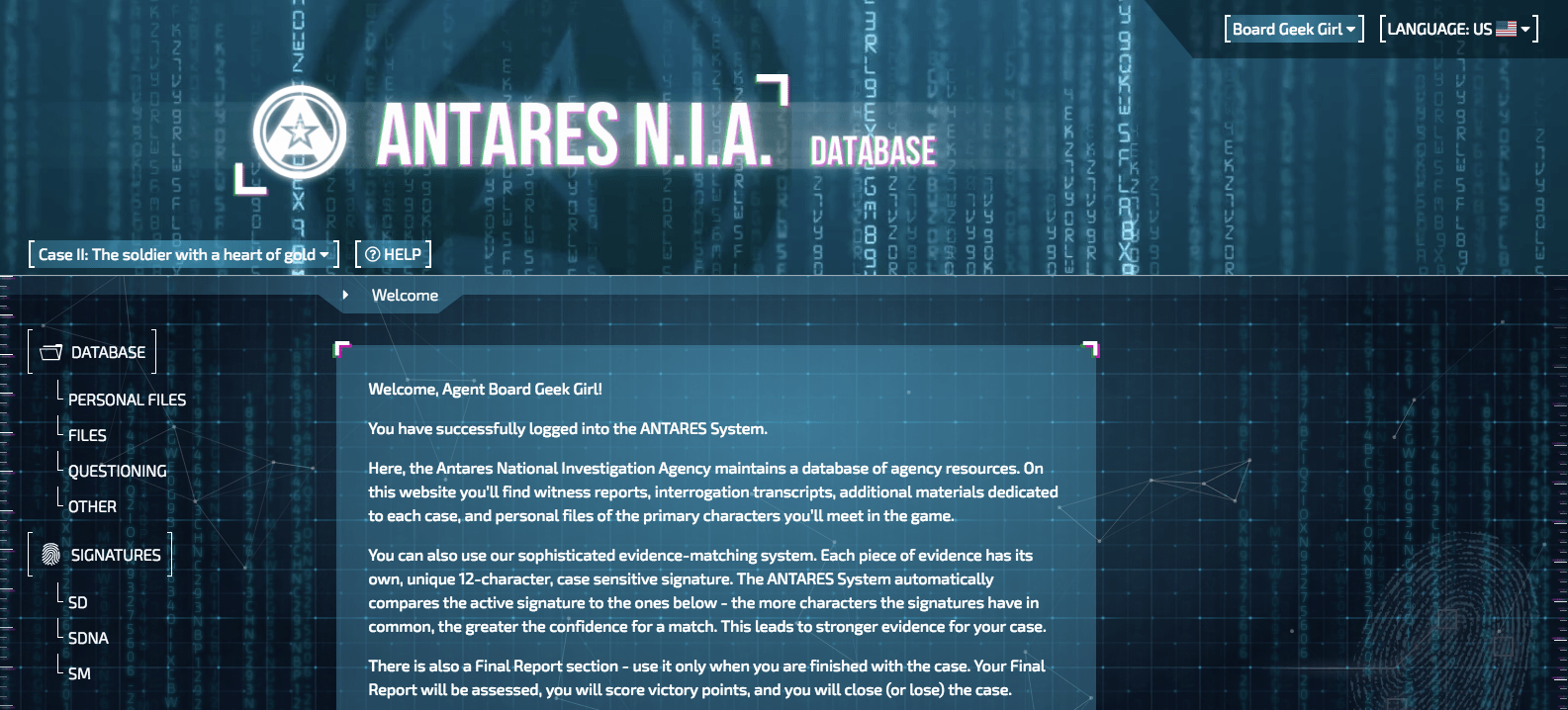 This database is a website where you enter names or file numbers, when directed to, which then provides rich information such as personnel files, witness testimonies or interrogations etc. Although it could have been done in an analog way, thematically it adds so much to the feel of the game that they couldn’t have achieved through cards and paper alone.