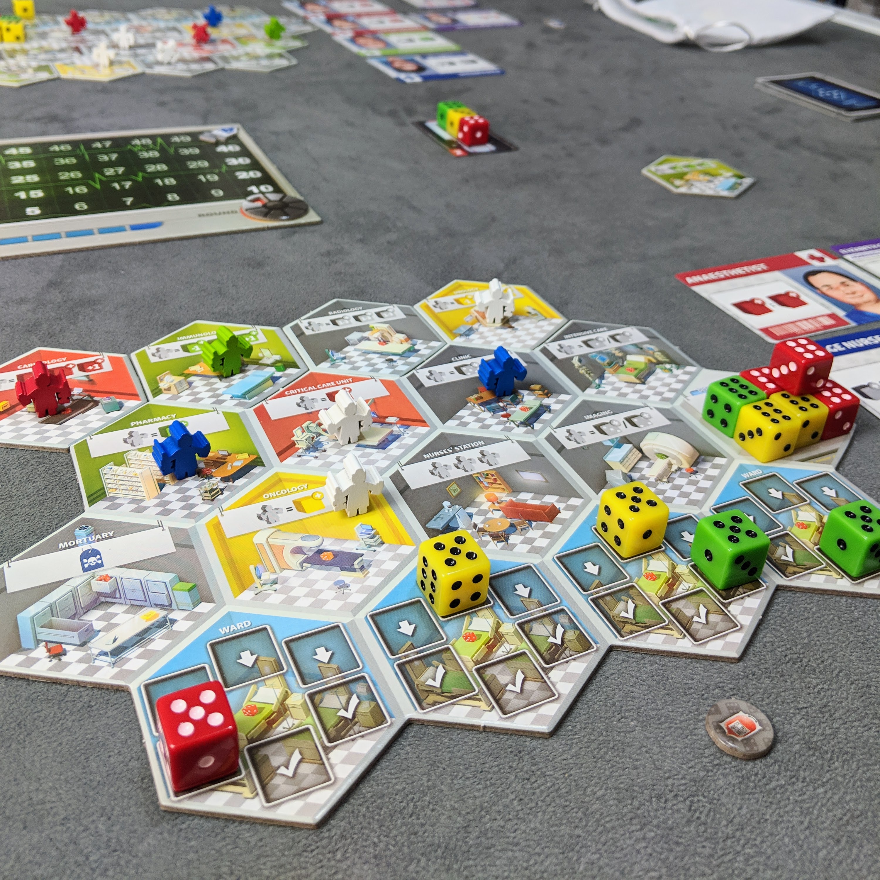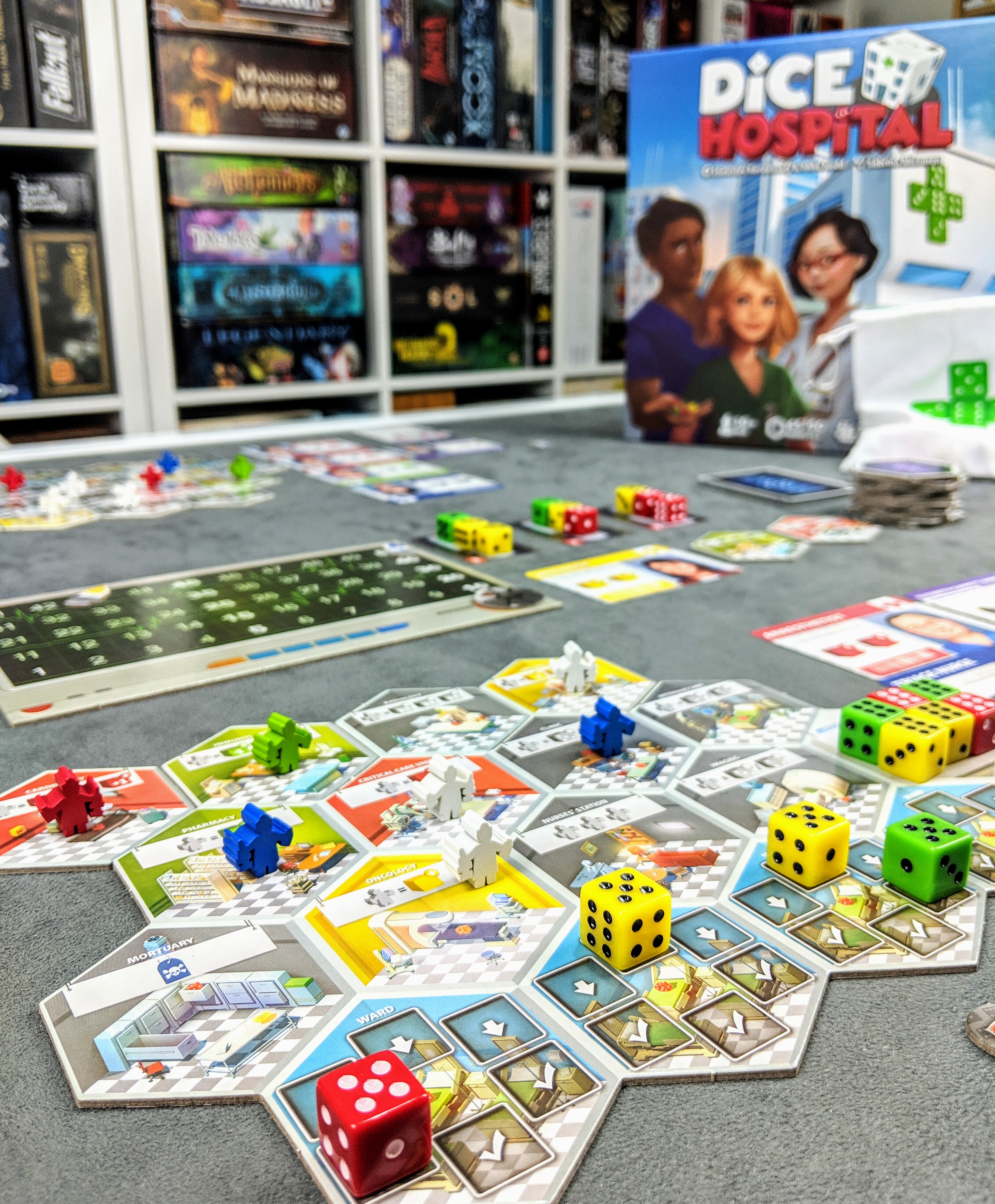 Patients are represented by dice, with a wellness scale of 0 being literally dead and over 6, the patient is full recovered and able to be discharged.