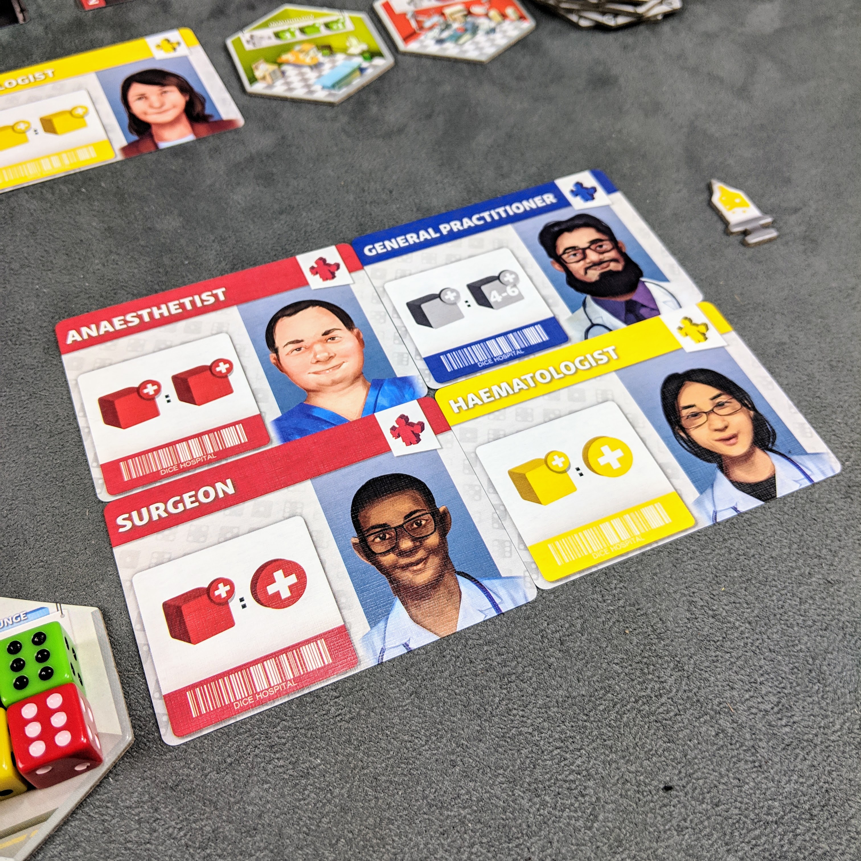 Each round starts with a drafting phase where you will admit an ambulance of three new patients to your hospital and then choose to either build a new room onto your hospital or hire a new specialist.