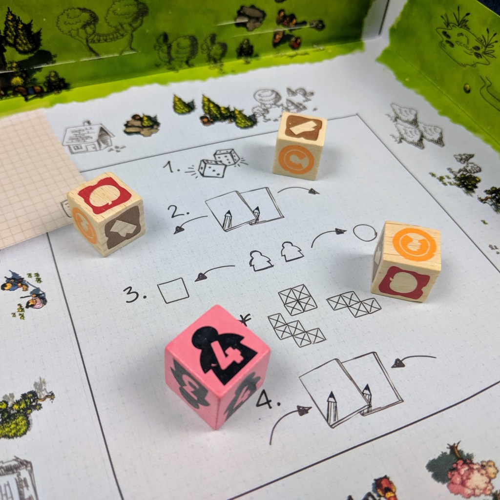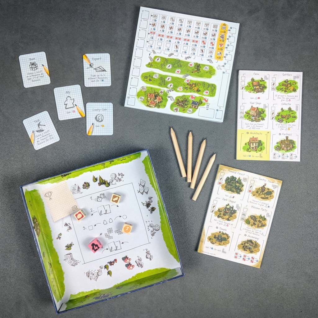 The art is in keeping with the original Imperial Settlers but with a charming hand-drawn feel. The components are simple, pads, dice, pencils and five favour tokens, all of good quality. I especially like that the dice are wooden rather than plastic!