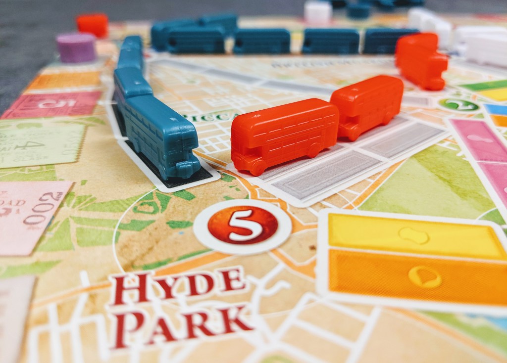 Ticket to Ride: London introduces Districts, which are represented on the board by numbers between each route. If you connect these numbers with your Buses, you will immediately score points equal to the district number. In the photo above, District two requires you connect four stops, but you are not required to connect every route between each number, just enough to connect them. Completing District two will score you two victory points.