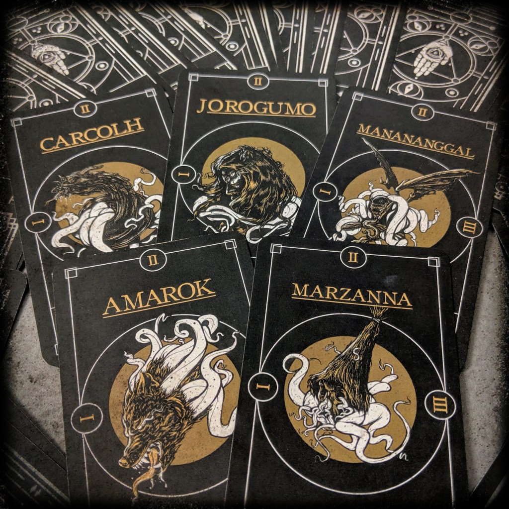 Occult is a 2 – 5 player card game with heavy take that elements as well as set collection. You will take on the role of a cultist, summoning monsters to take over the world, whilst slaying the monsters of your enemies or playing cards to hinder them so that you can reign supreme! You may form pacts and alliances in this game but those will be short lived as there can only be one winner!
