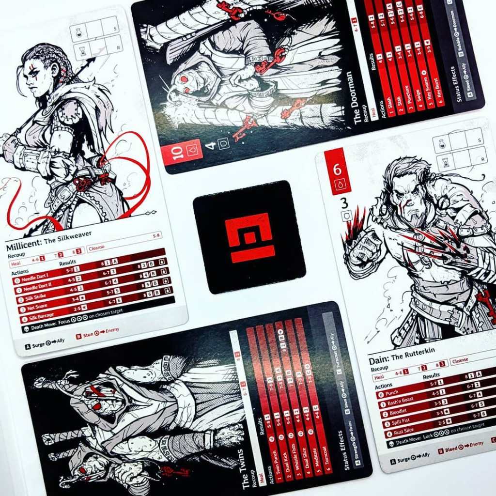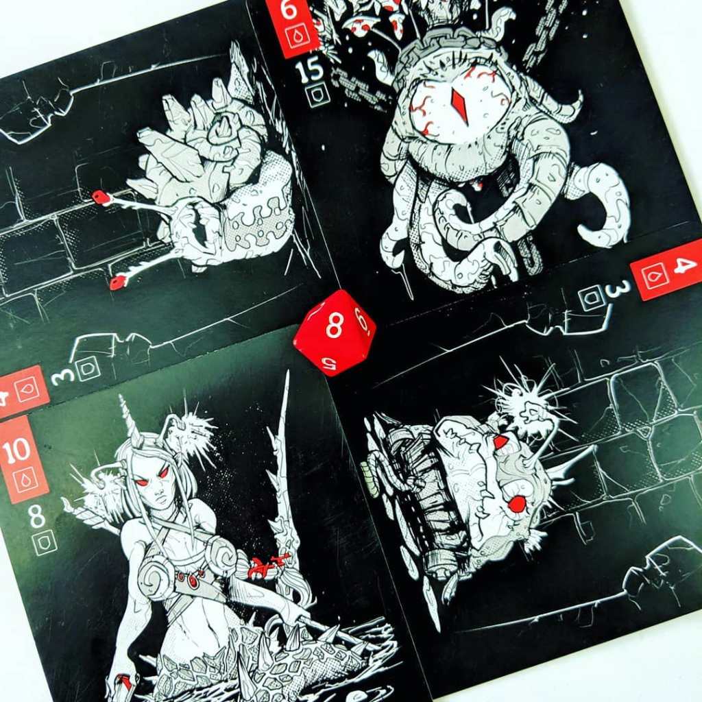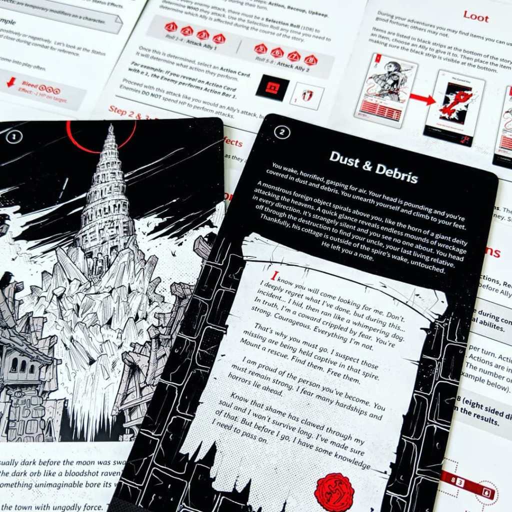 Spire’s End is a card game reminiscent of the Choose Your Own Adventure books of the ’80s. With striking artwork in a simple colour palette of red, white and black, this is a dark adventure for 1 or 2 players.