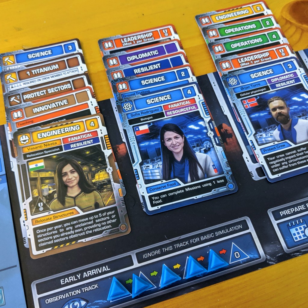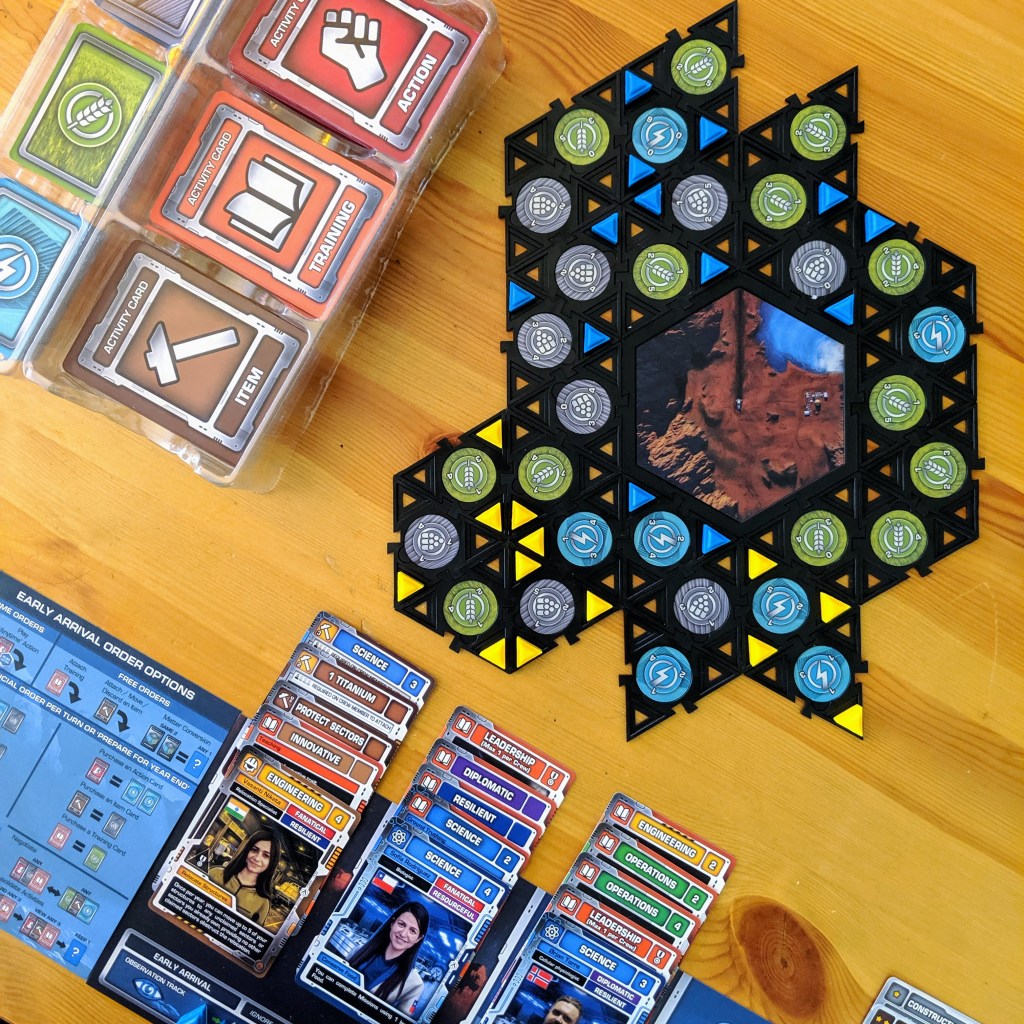You will start the game with just two crew members, a few claimed sectors of the planet and a handful of activity cards and resources. At the start of each year you will gain resources equal to sectors you control and their productivity levels. Over the years you will expand your control over more sectors and upgrade their productivity.