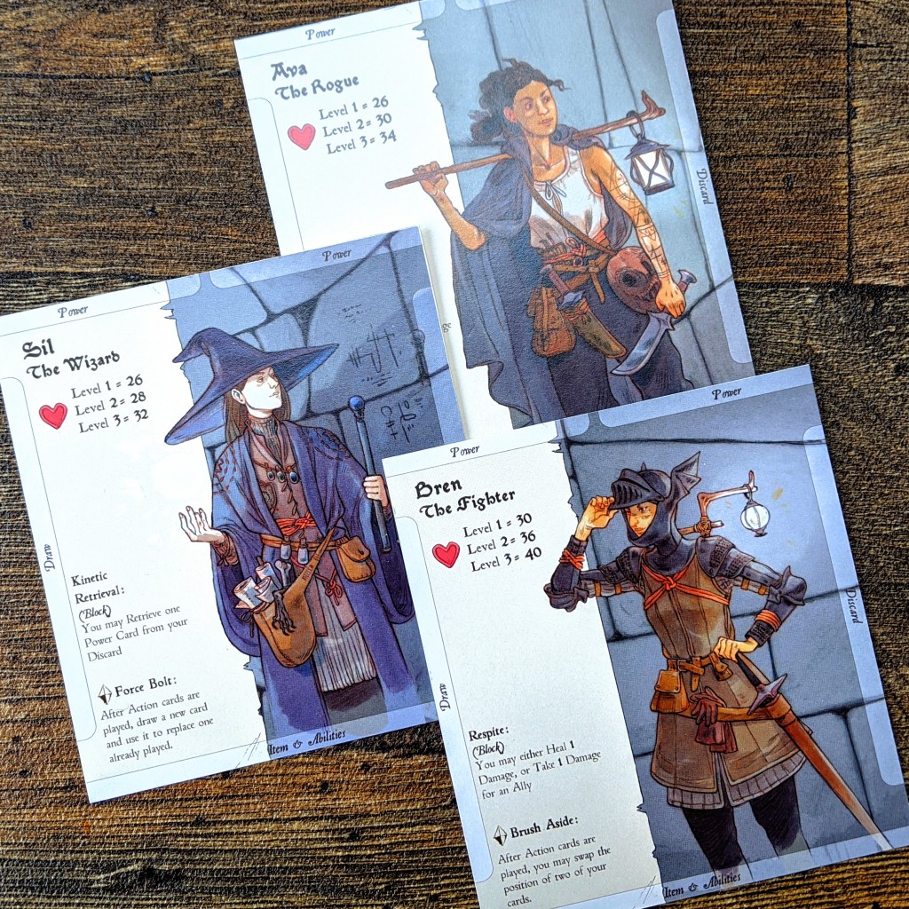 Players each choose one of three characters – Wizard, Fighter or Rogue. Each character comes with it’s own unique abilities and equipment cards to progress your character as you ‘level up’ through the game by going deeper into the dungeon and gaining XP through encounters.