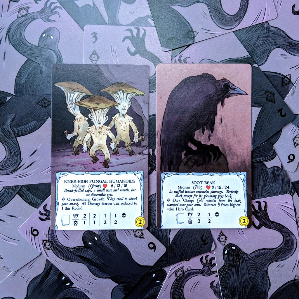 You will play your cards to the table, being careful not to go too high, wasting your best cards, nor too low, weakening your defences. Once you have chosen your cards, you will draw cards from the monsters deck to face each card. The pairs of cards are then compared and will either result in a monster attack, a player attack, or a block (draw). Character abilities and equipment can also be used to counteract or rearrange cards to your advantage.